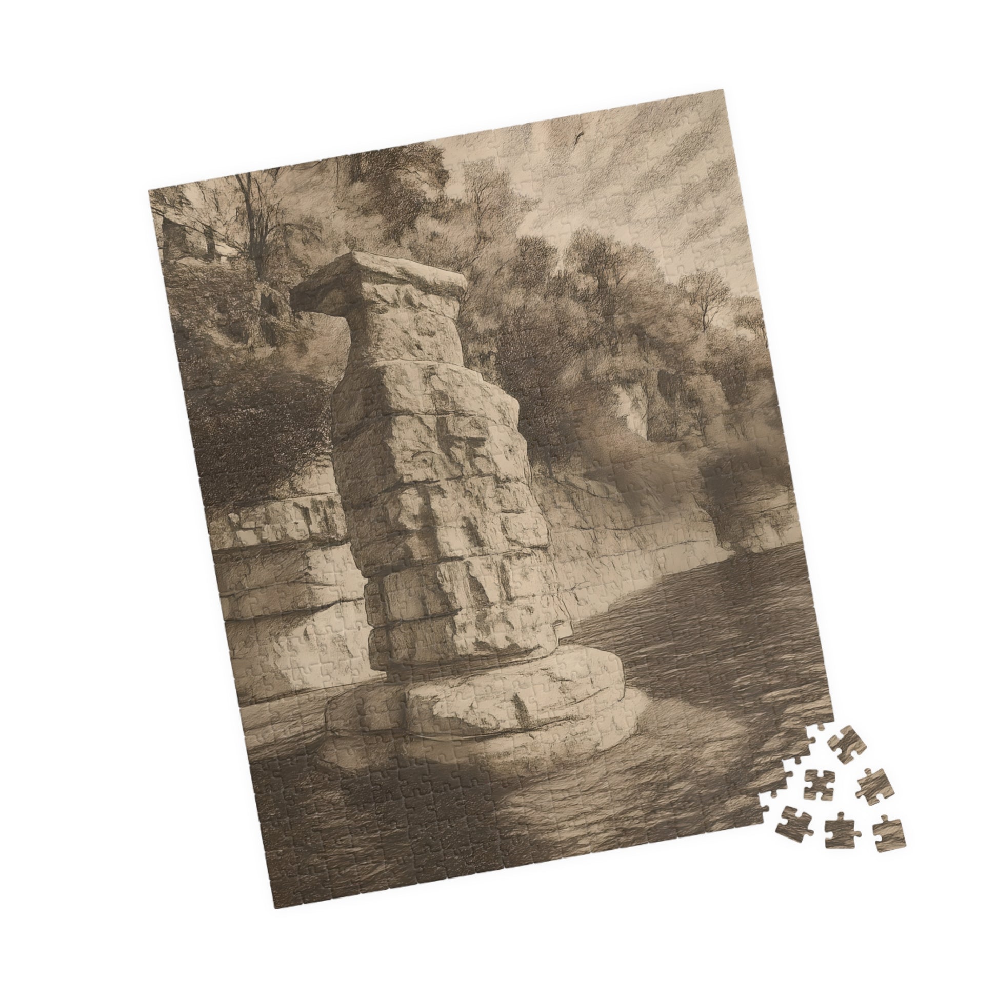 Bring the iconic beauty of Herrington Lake's own Chimney Rock into your home with this fine art print, faithfully reproduced from an original pencil and charcoal sketch. This artwork captures the majestic, stacked rock formation, known to geologists as a "candlestick formation," as it proudly stands amidst the waters of the lake.