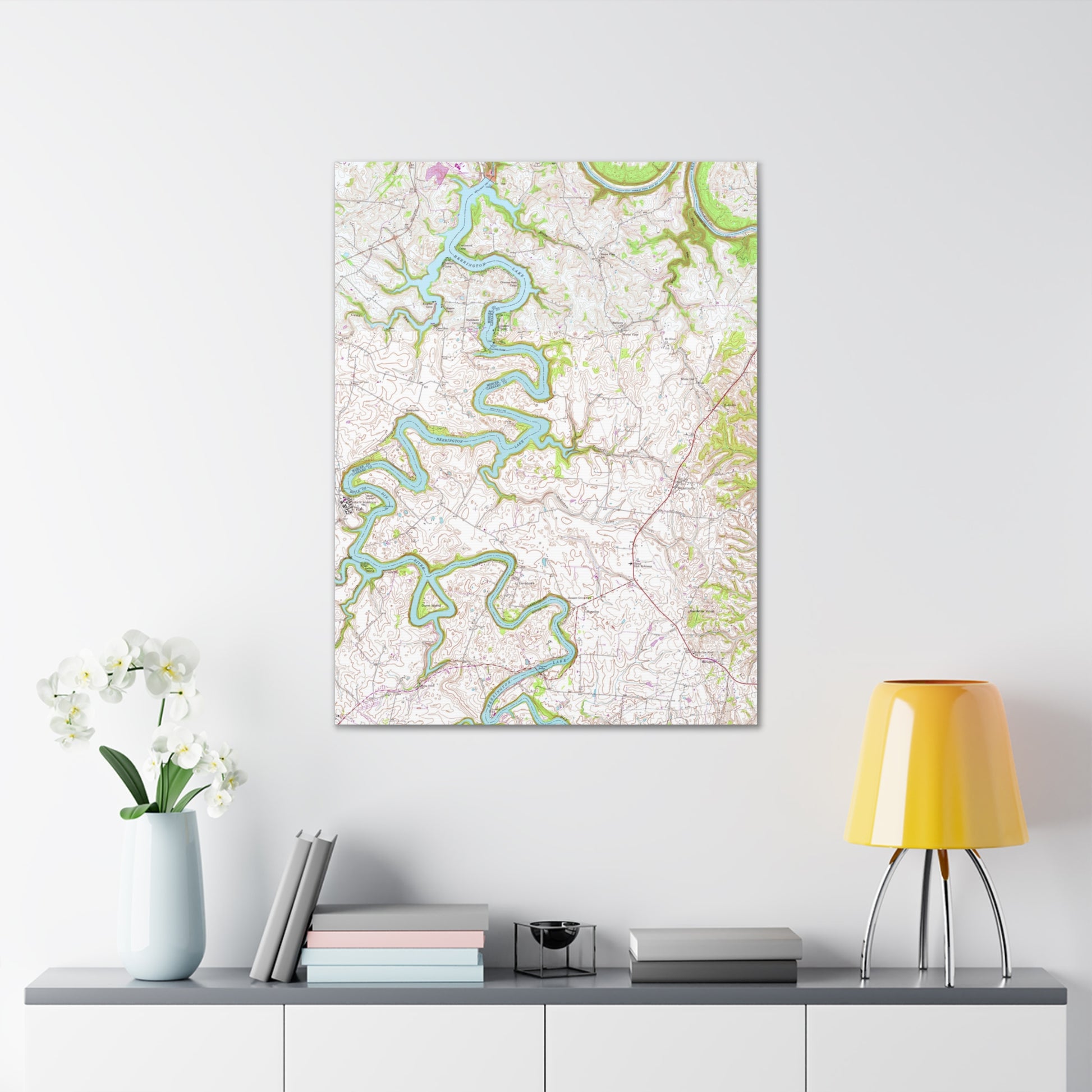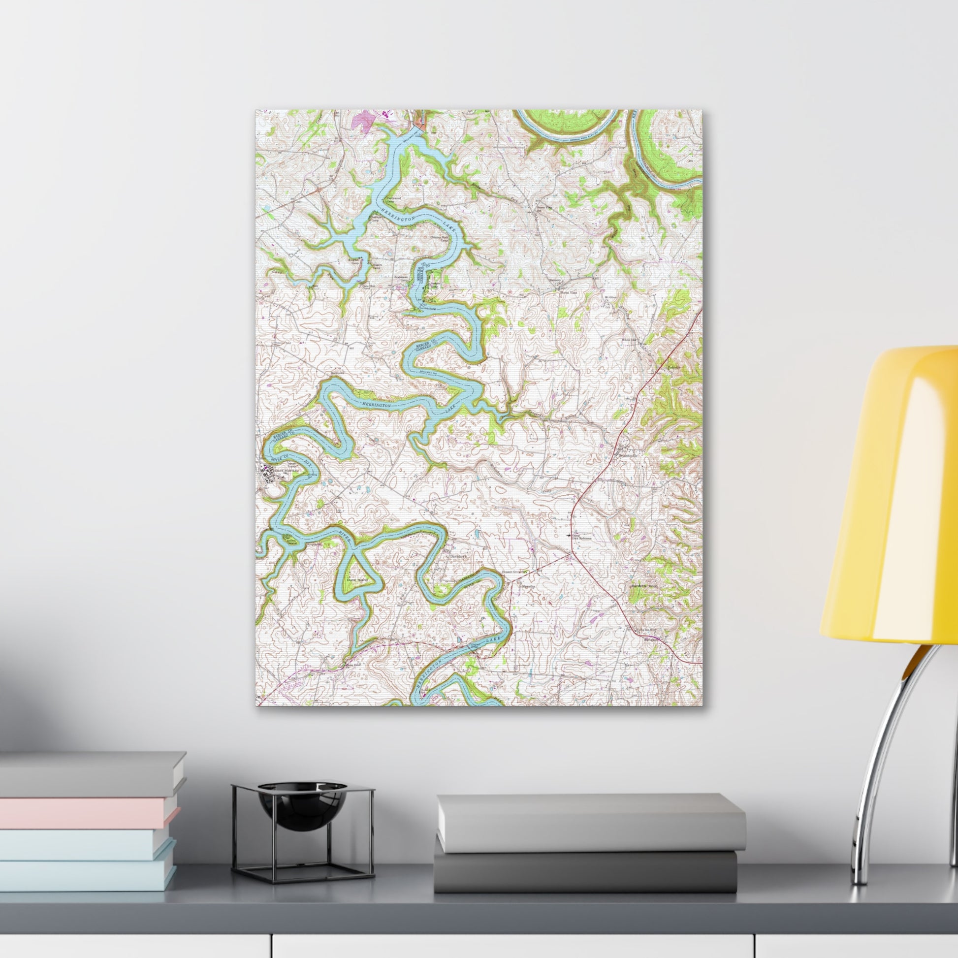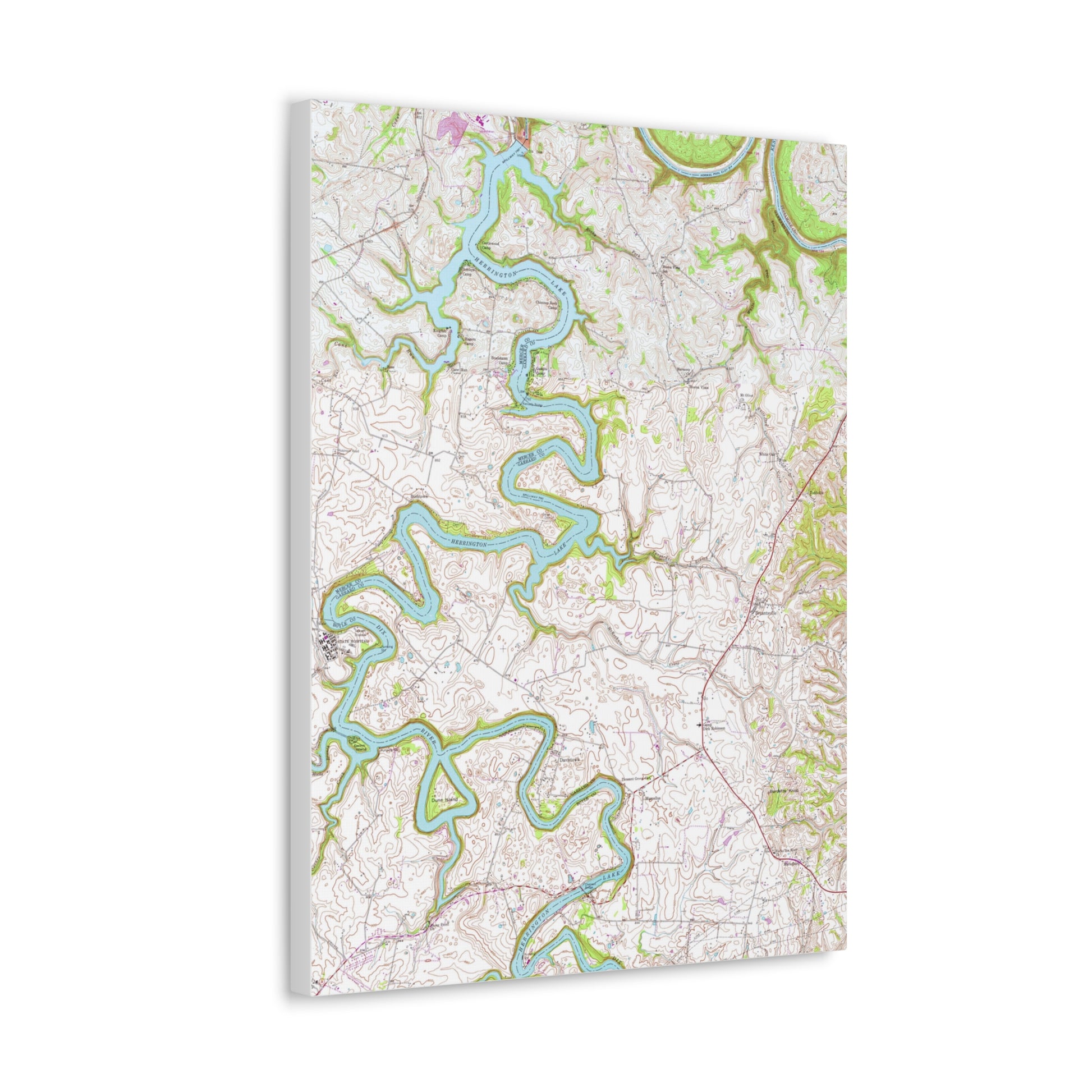 This canvas features a high-resolution copy of a hand drawn and inked 1952 map of the Herrington Lake area, produced by the United States Geologic Survey. This design is a combination of two "quadrangles" (the terminology used by the USGS for specific areas of land to be mapped) that are home to our favorite Kentucky lake, the Wilmore Quadrangle (the lake north of the Kennedy Bridge) and the Bryantsville Quadrangle (the lake south of the Kennedy Bridge). For this design, we have pieced the two separately hand-drawn maps together to form the complete tri-county area. This map represents it's original coloring, as drawn and inked by the USGS in 1952. You can uplift any room's decor with art that's printed on top-quality canvas gallery wraps, and this is a great addition to your lakehouse or gift to that Herrington Lake lover in your life. Each wrap is made with finely textured, artist-grade cotton substrate which helps reproduce this image in outstanding clarity and detail. Available in two sizes, these closed-back canvases are built with a patented, solid support face and are excellent for indoor use.